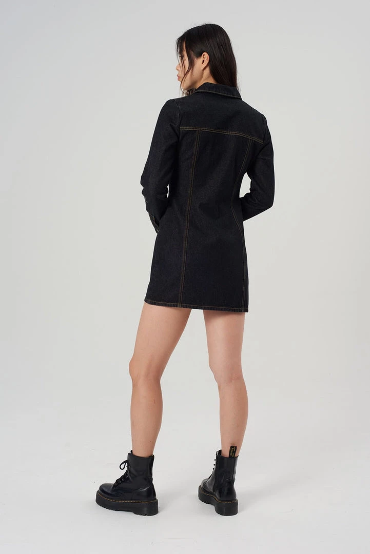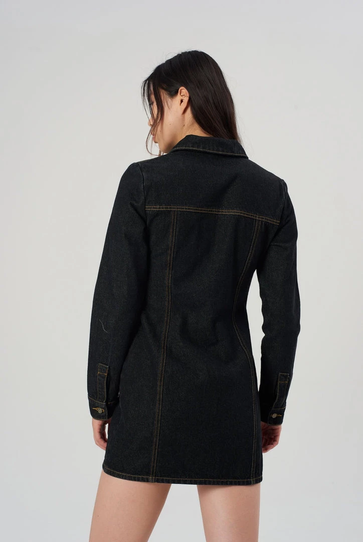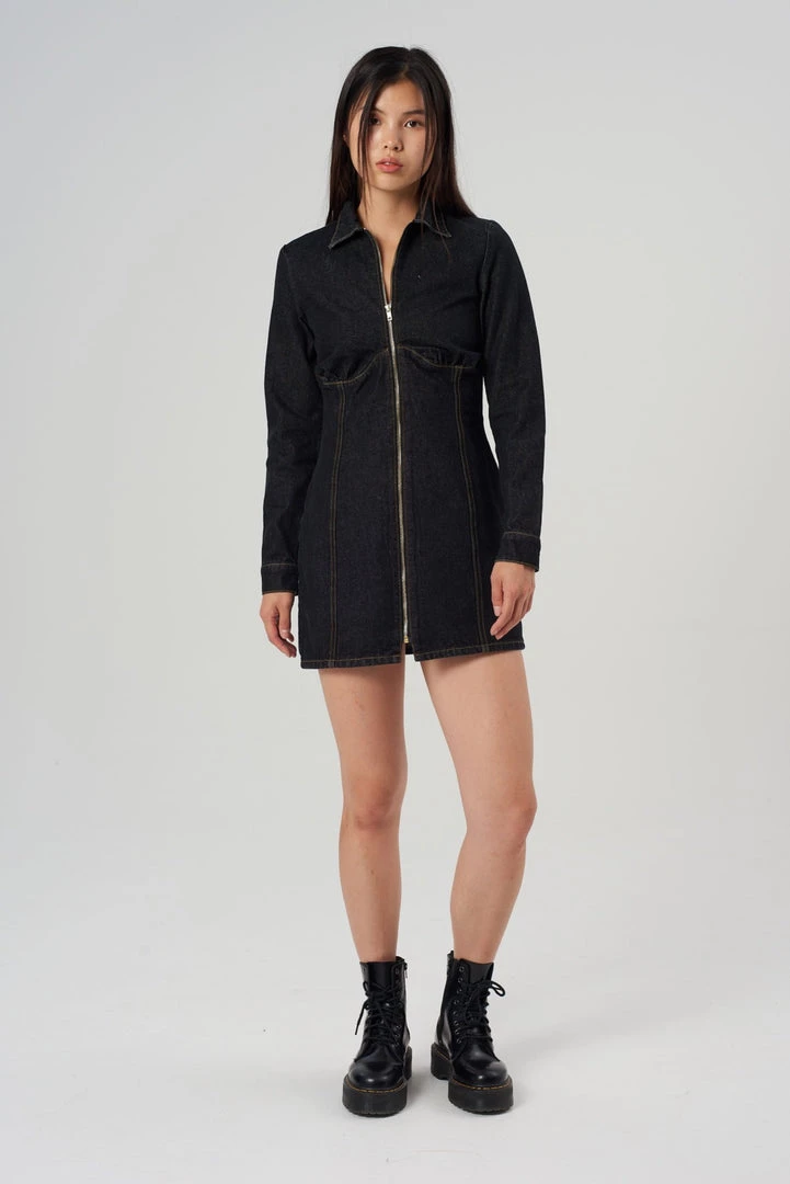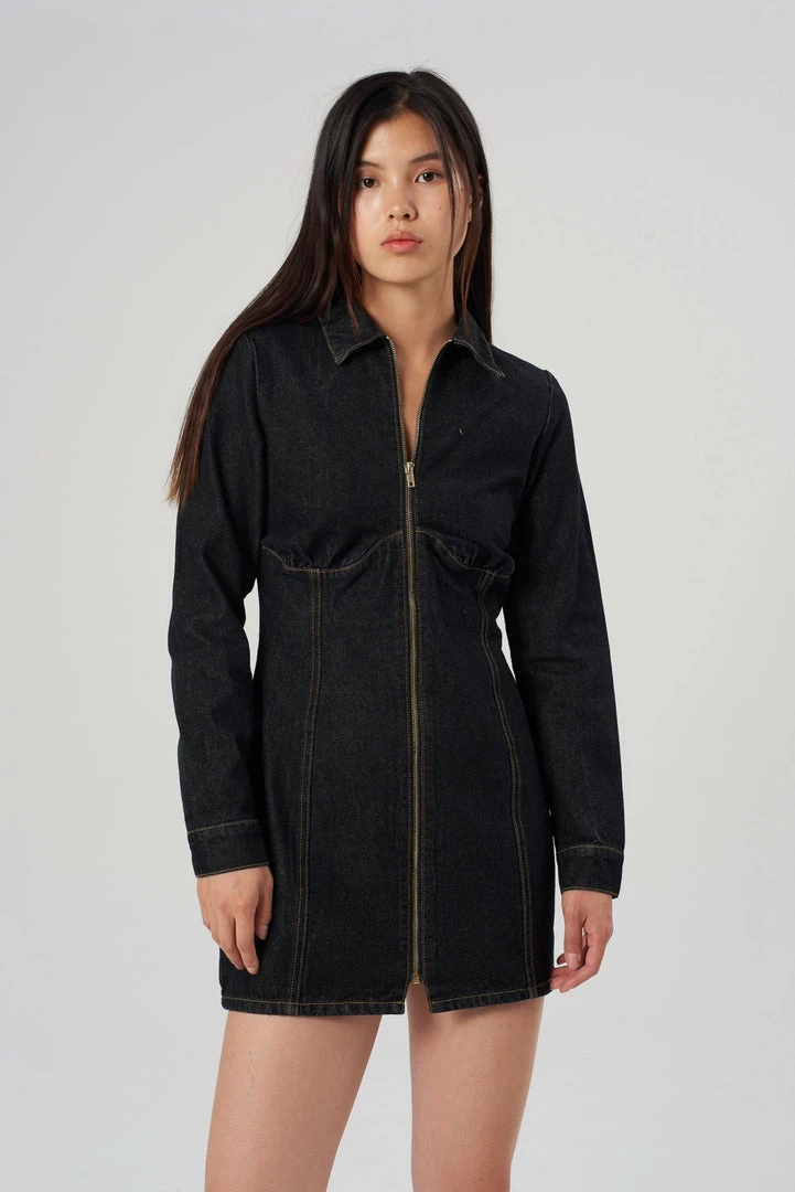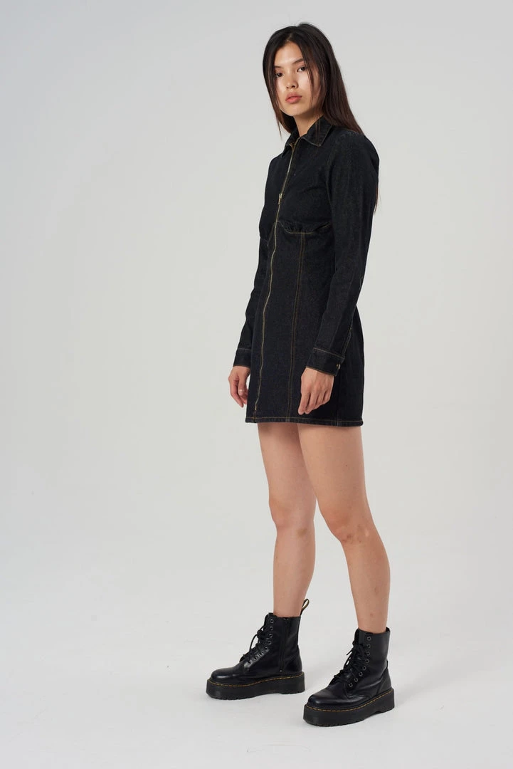 The Infinite Dress is our black denim fitted long sleeve dress with front zip fastening. Crafted with recycled cotton.