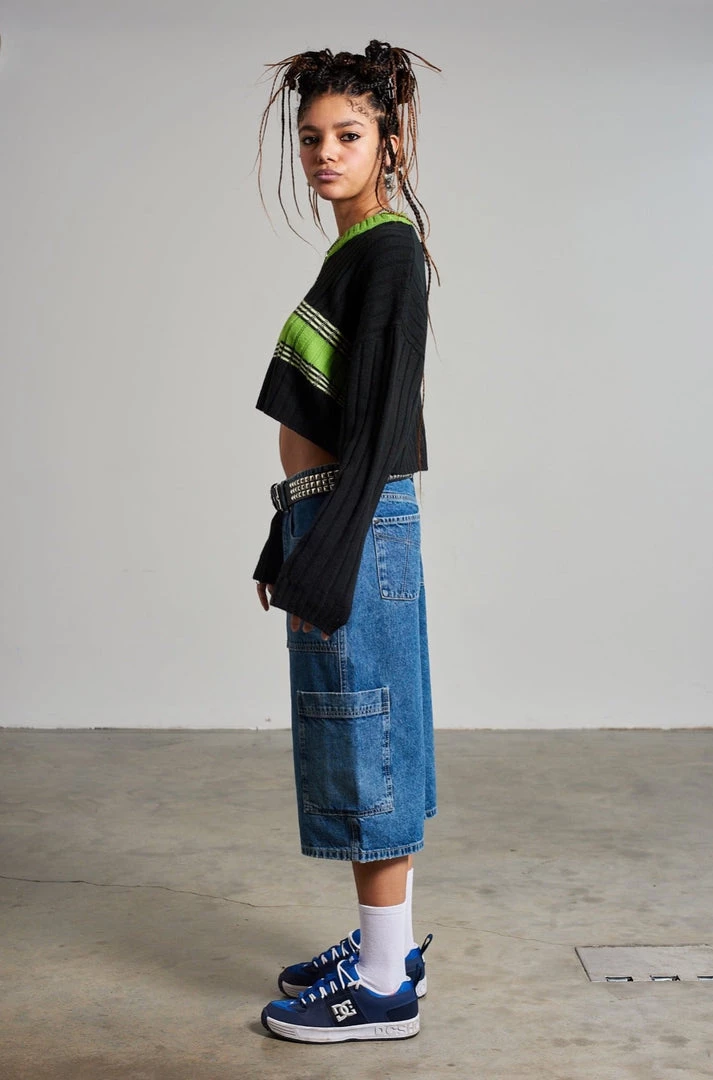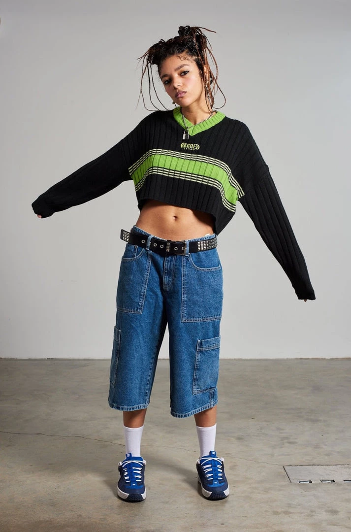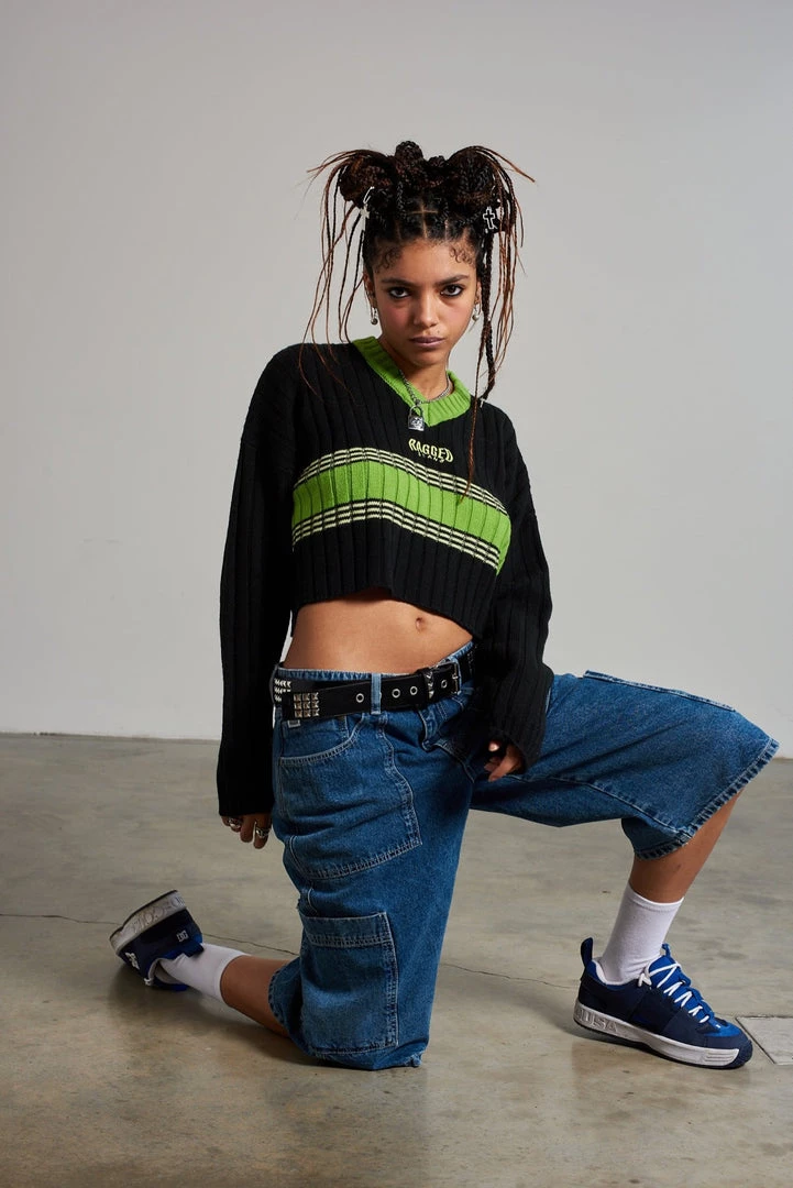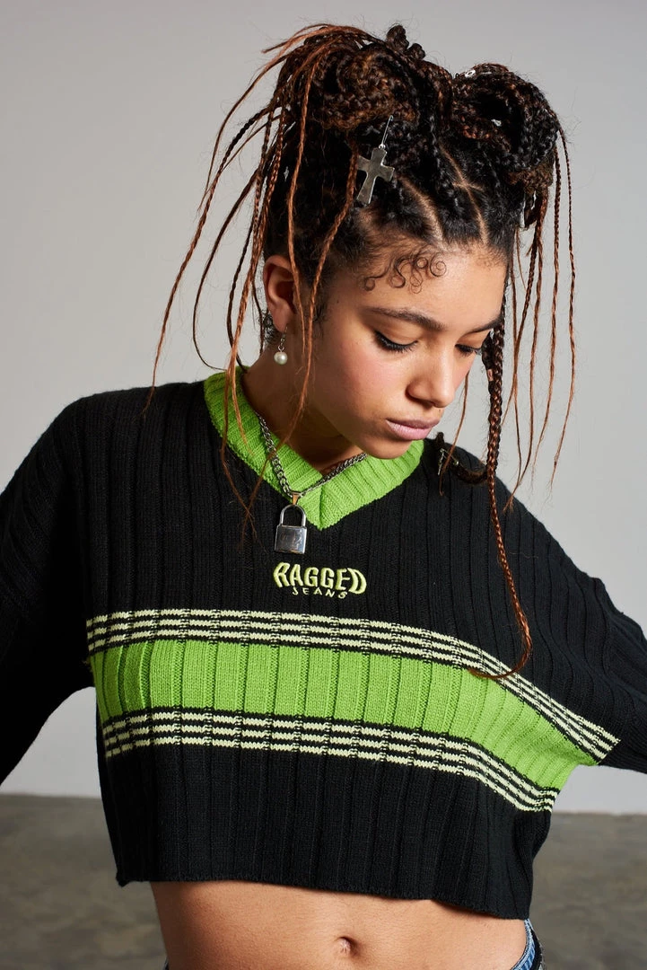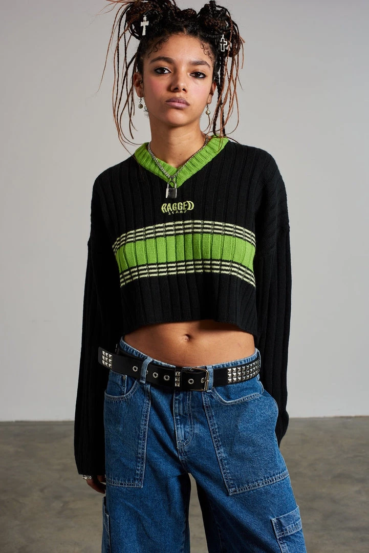 Ragged Jeans black v-neck knitted cropped jumper with green stripe and embroidered ‘Ragged Jeans’ logo.