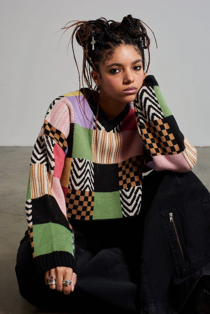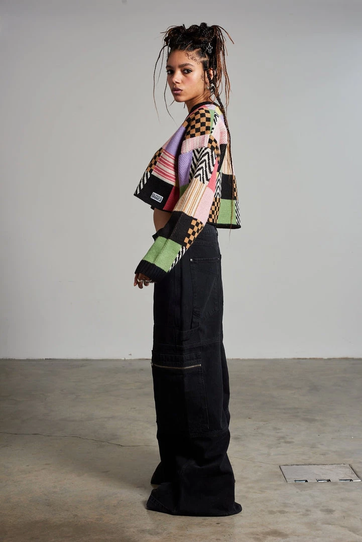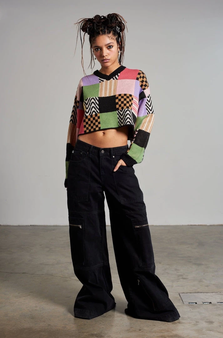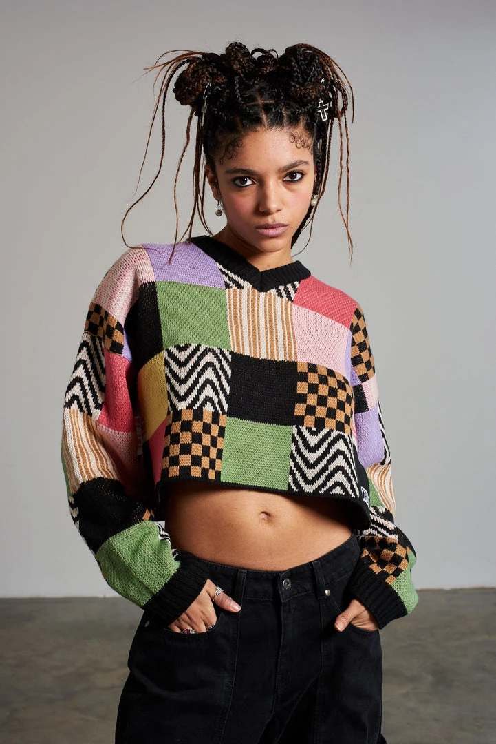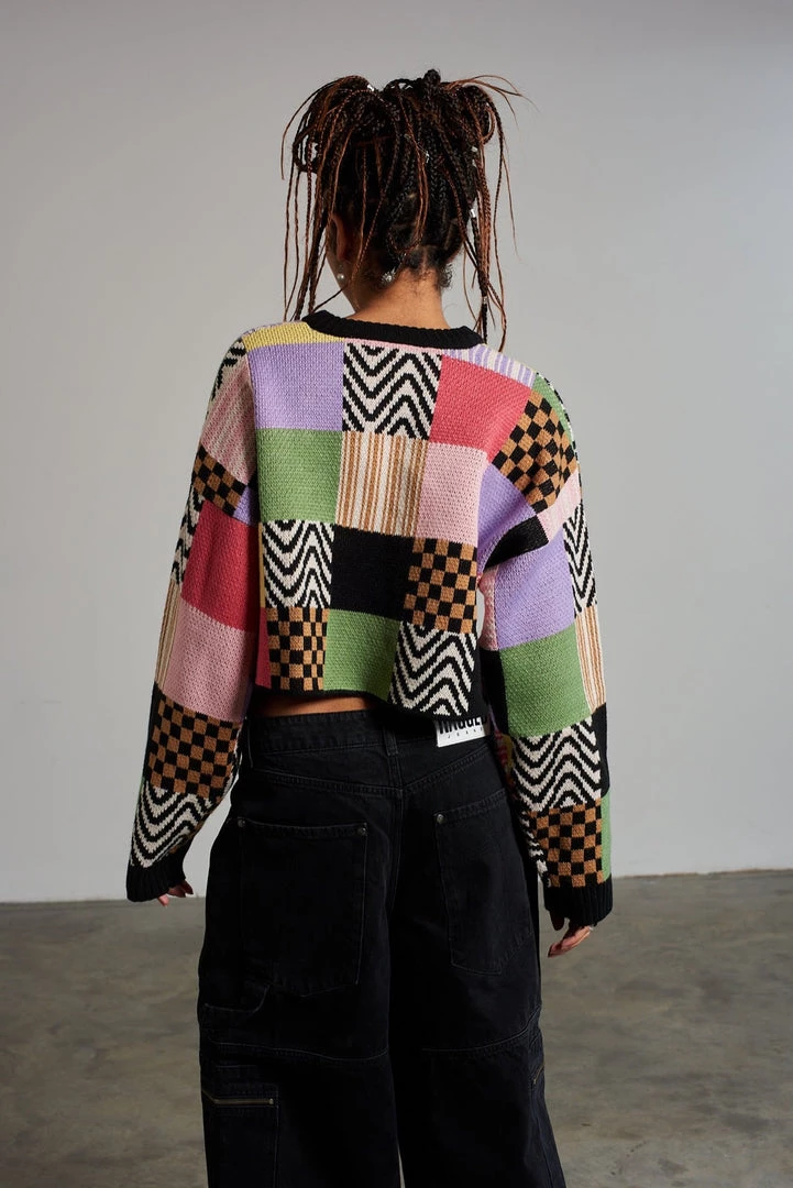 Ragged Jeans multicolour patchwork cropped jumper with black trims and ‘Ragged Jeans’ logo tab.