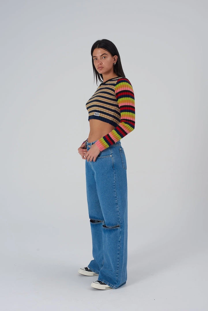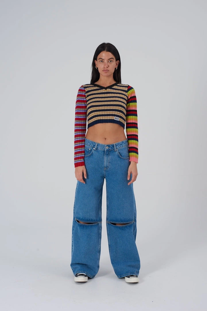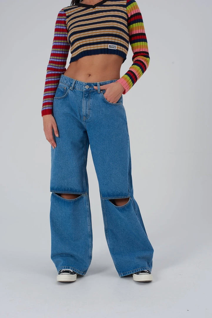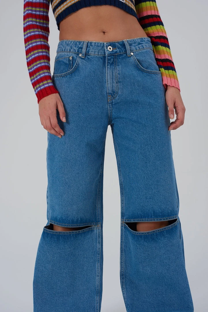 Ragged Jeans blue baggy skater style low-rise jeans with knee cut detail.