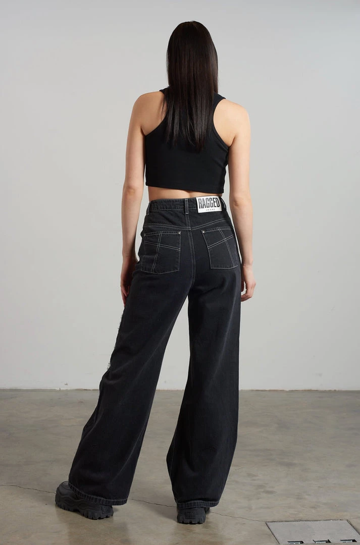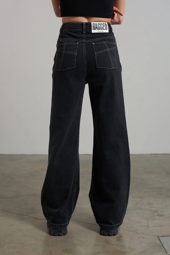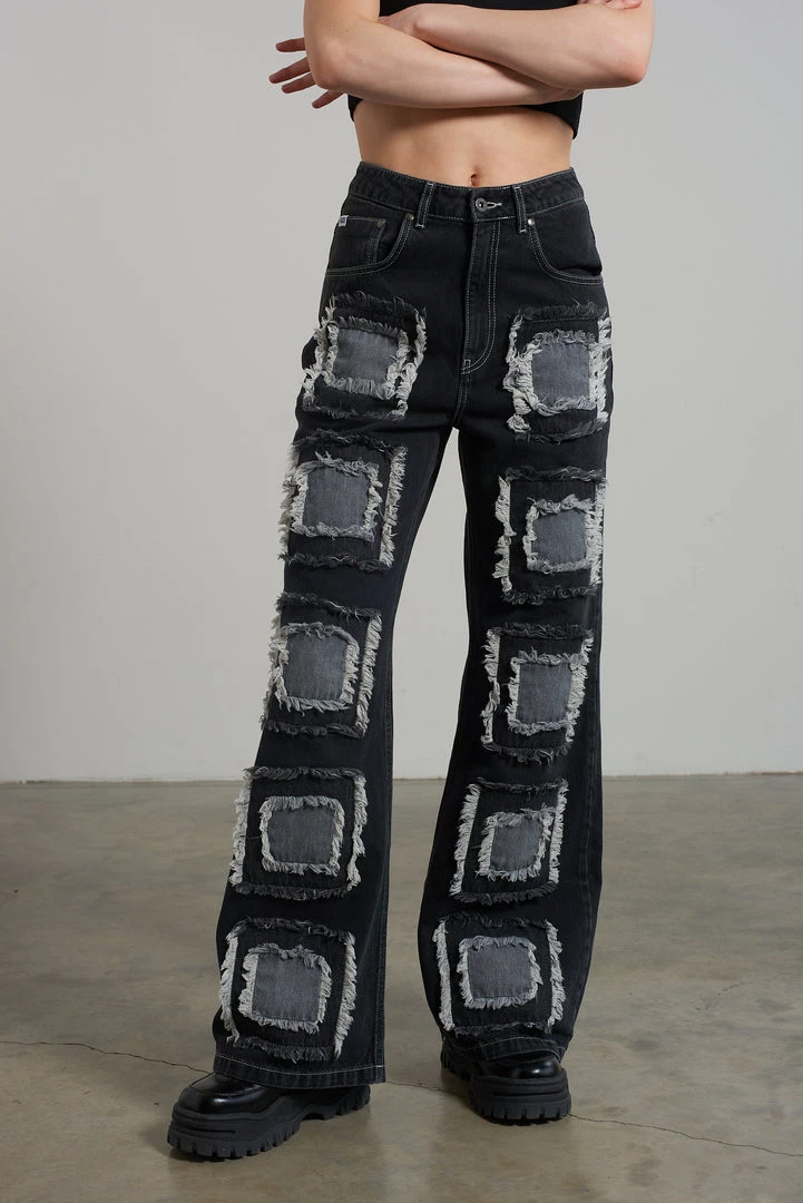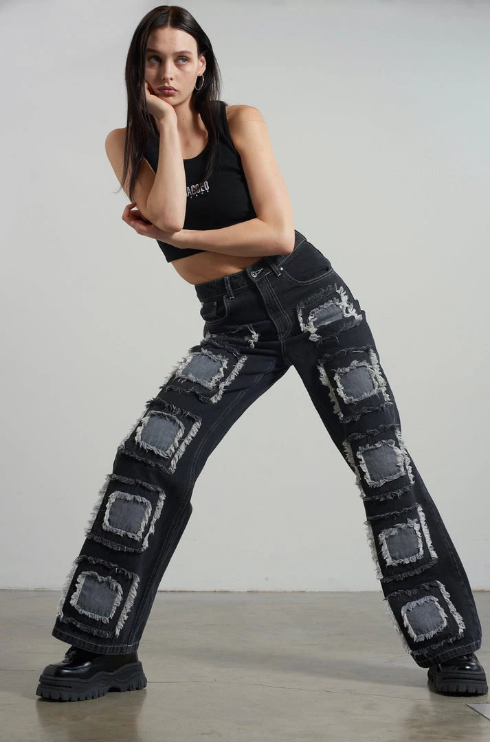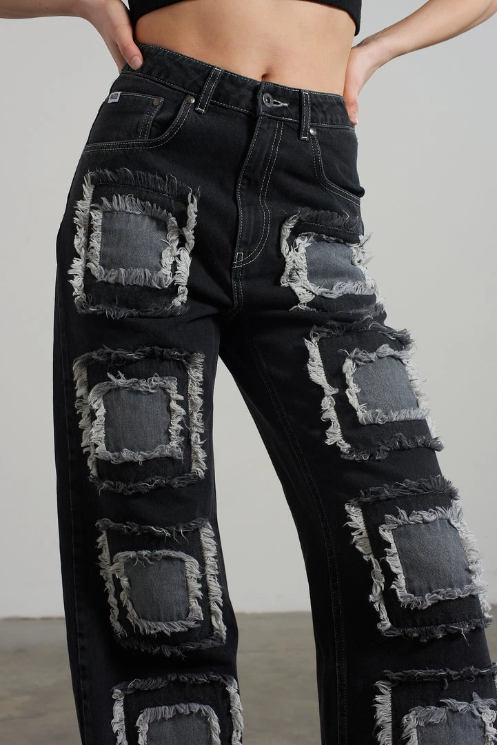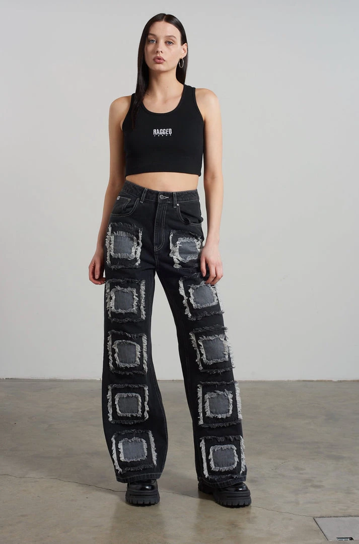 Ragged Jeans charcoal baggy denim jeans with appliqué squares detail.