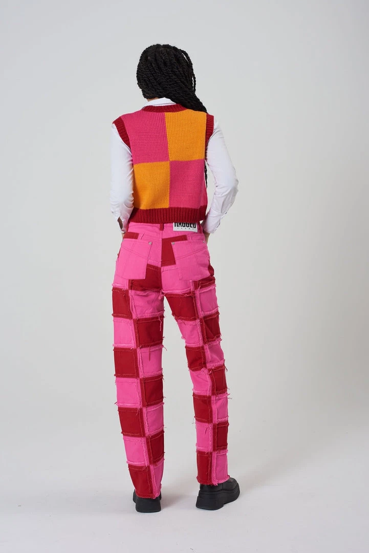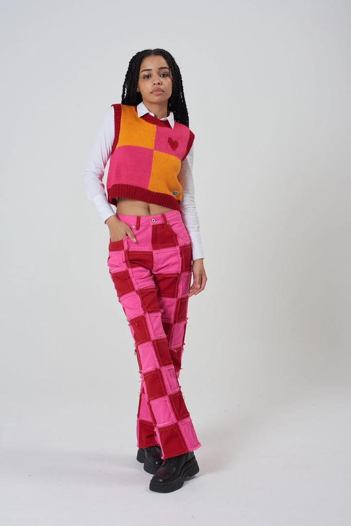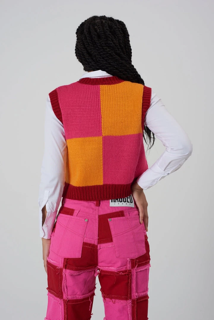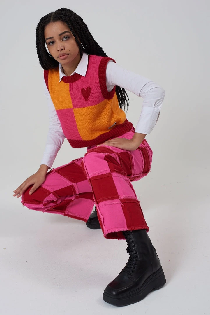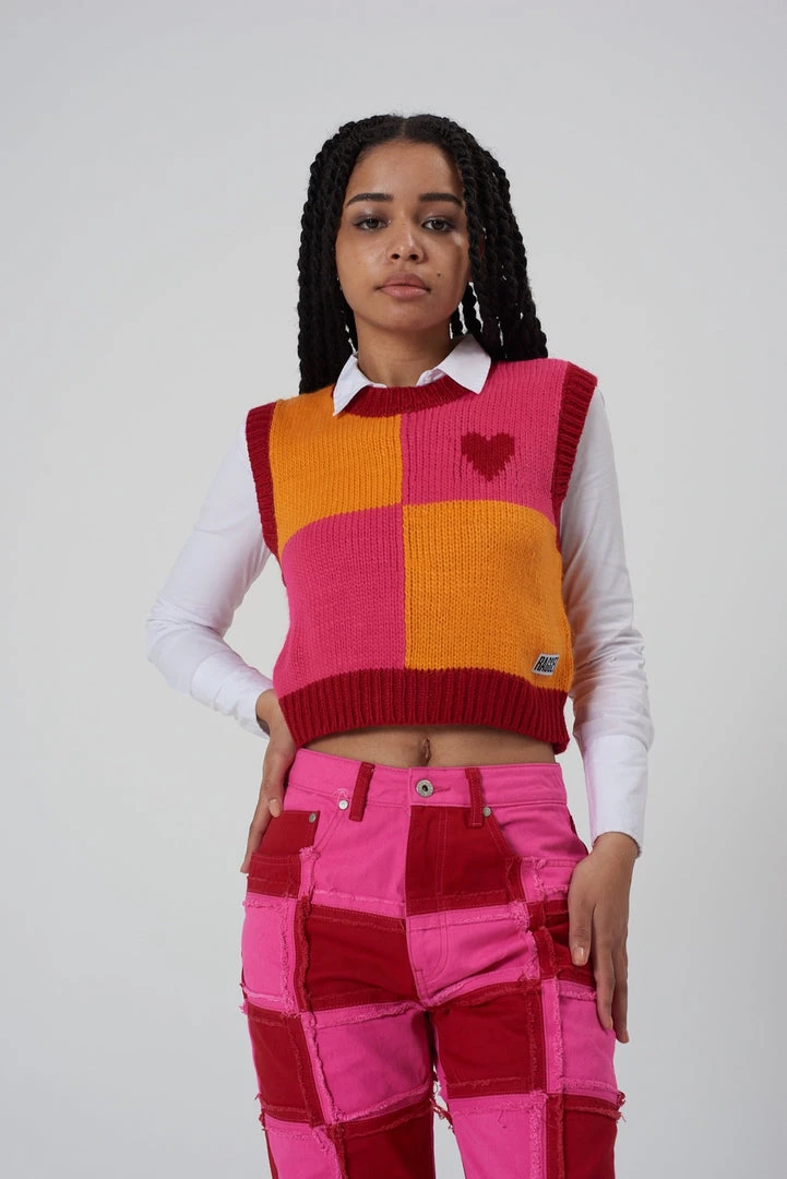 Ragged Jeans pink & orange panel knit vest with heart detail.