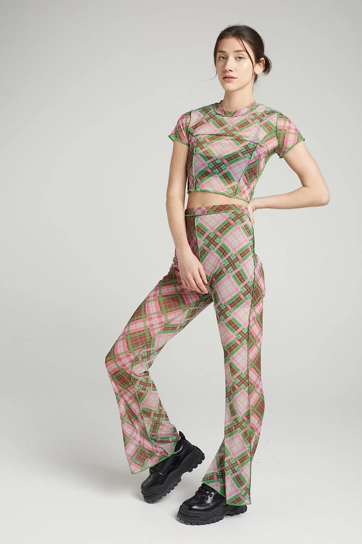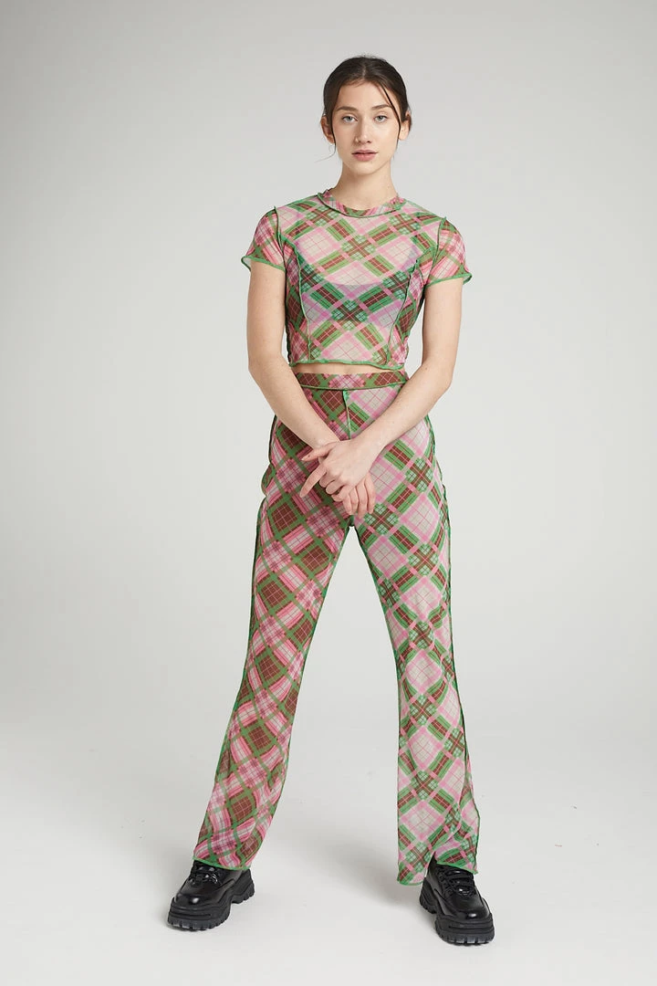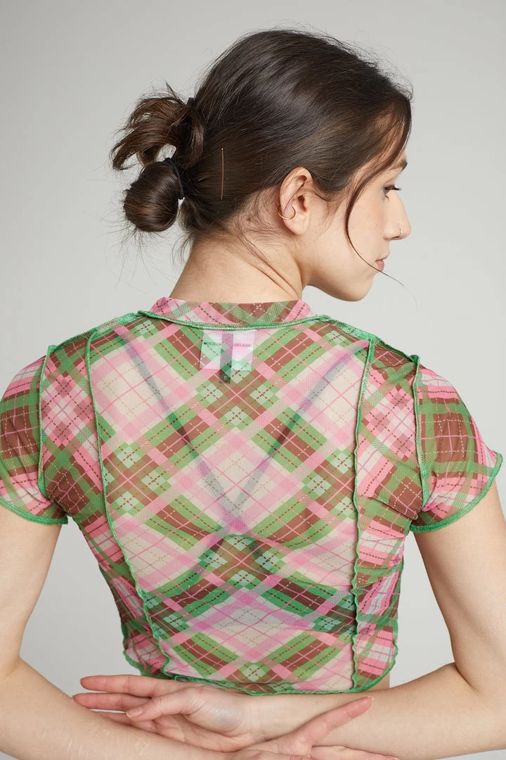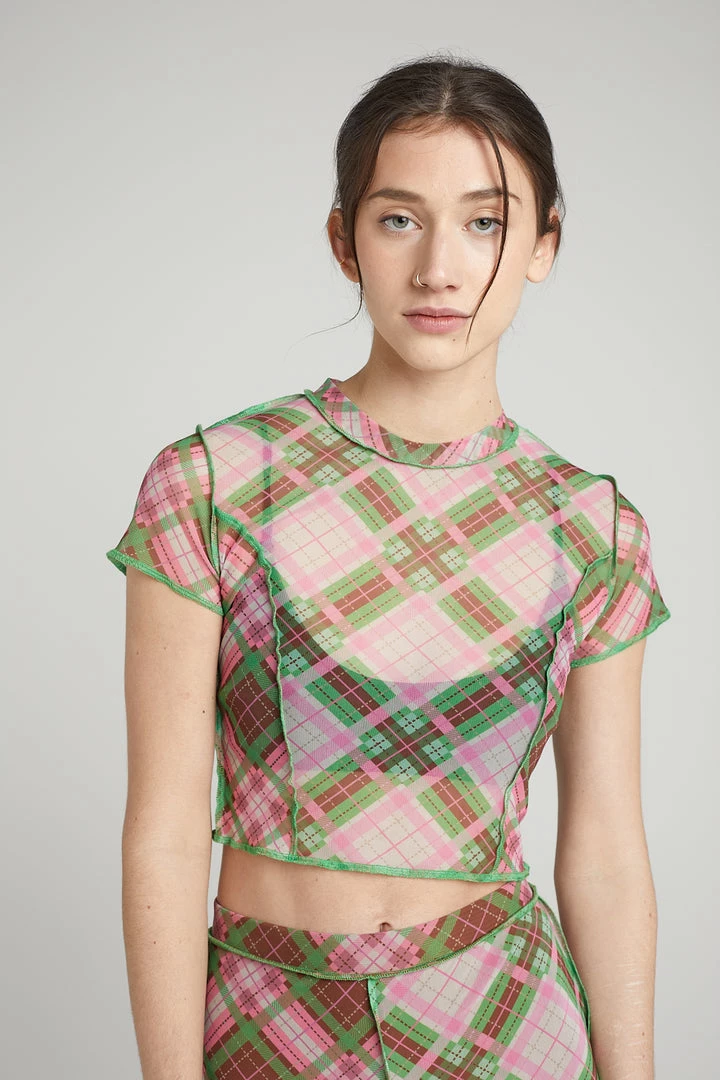 The Ragged Priest check mesh ringer cropped top with exposed seams and panelling.