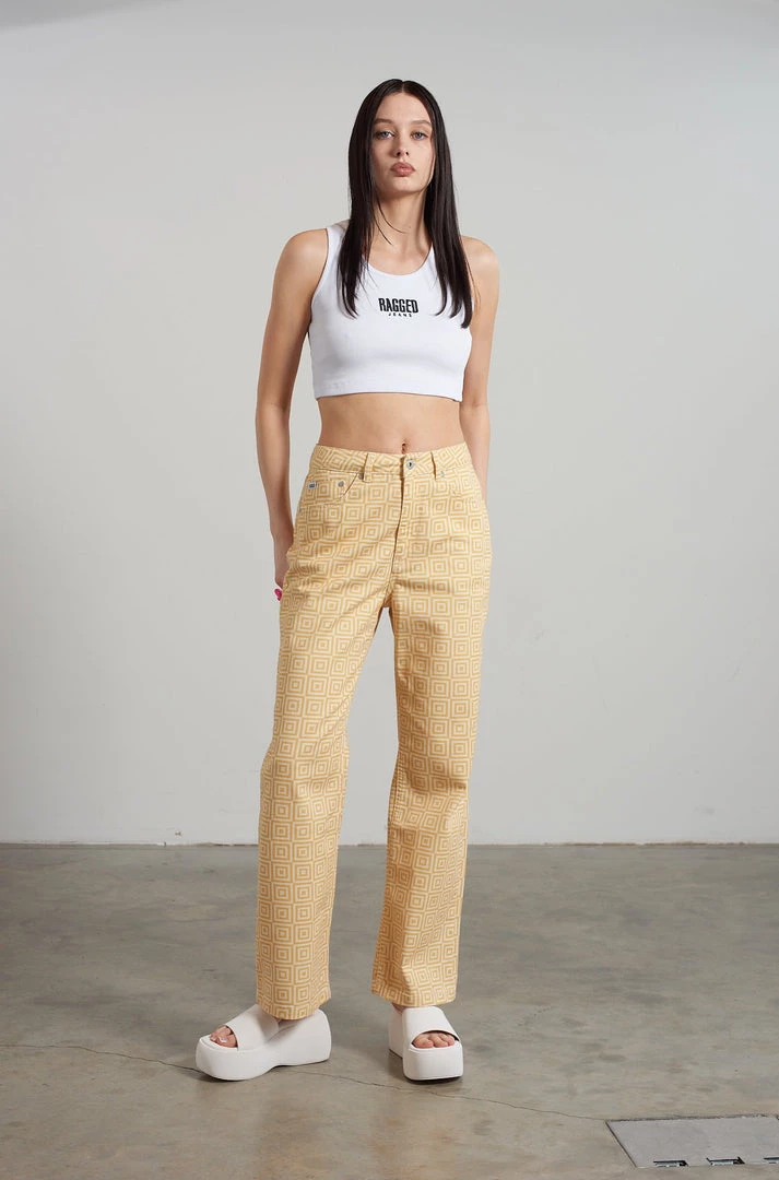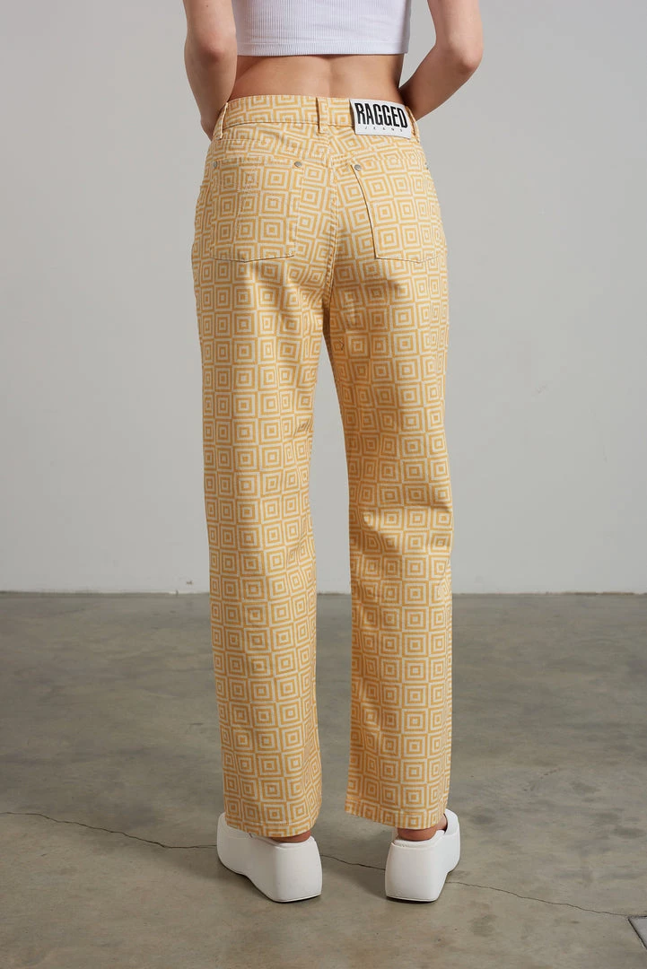 Ragged Jeans yellow and cream square print denim dad jeans.
