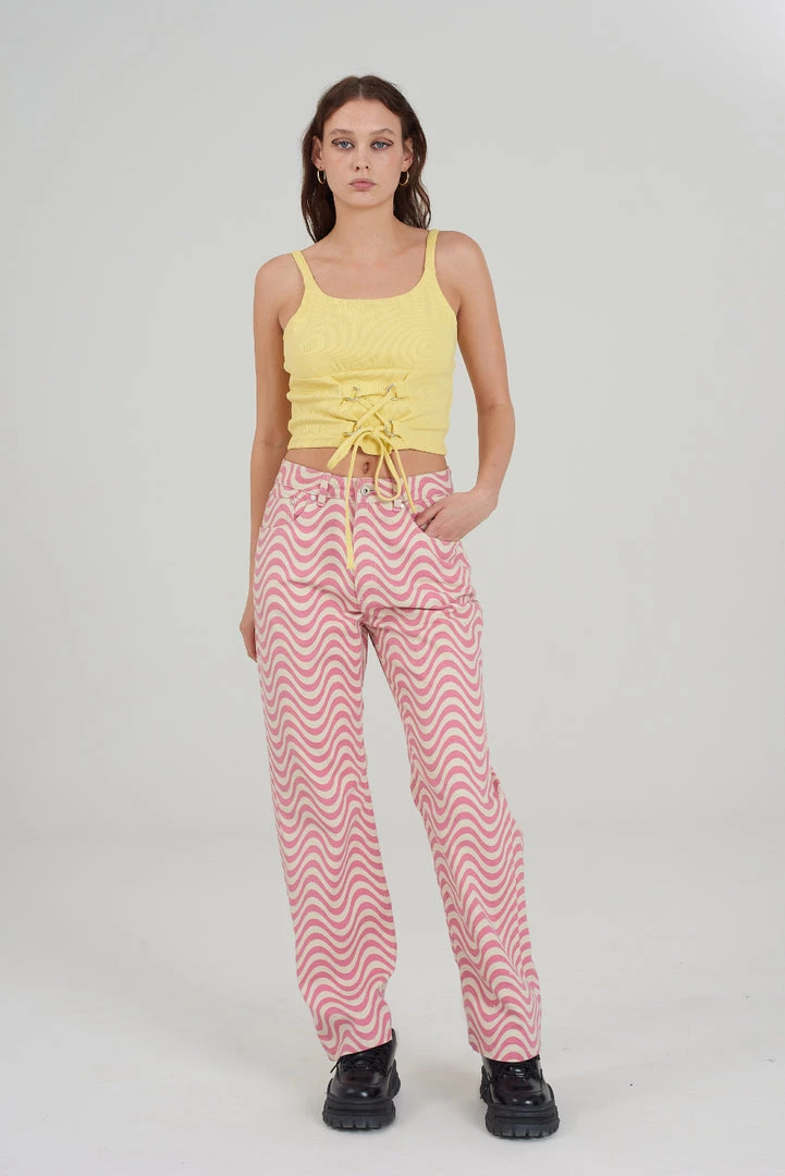 The Ragged Priest cropped sleeveless corset style yellow top.