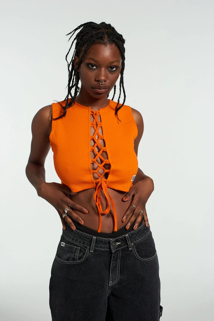 The Ragged Priest Orange crop top with cut out front and lace up detailing with tie finish.
